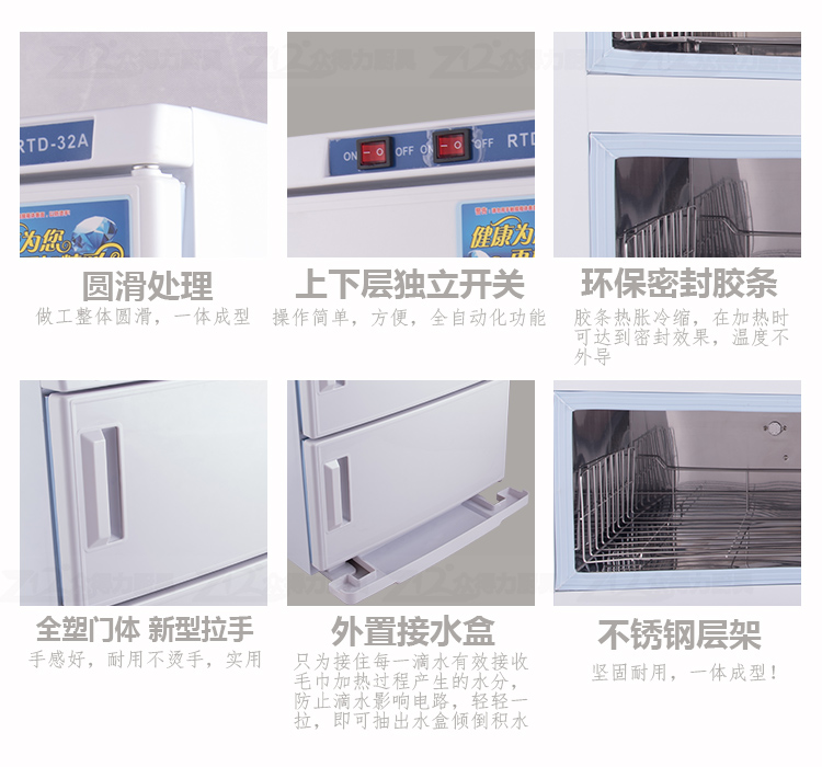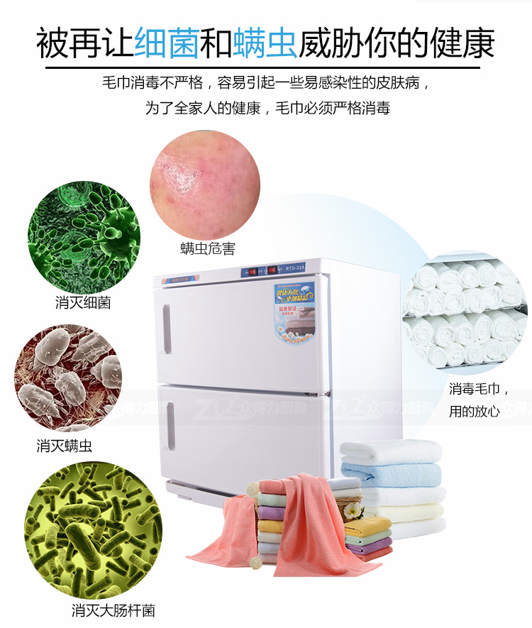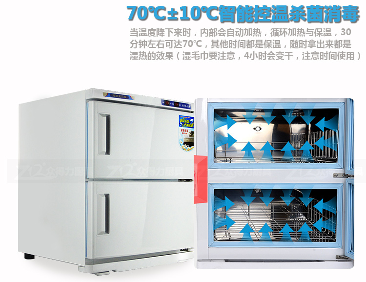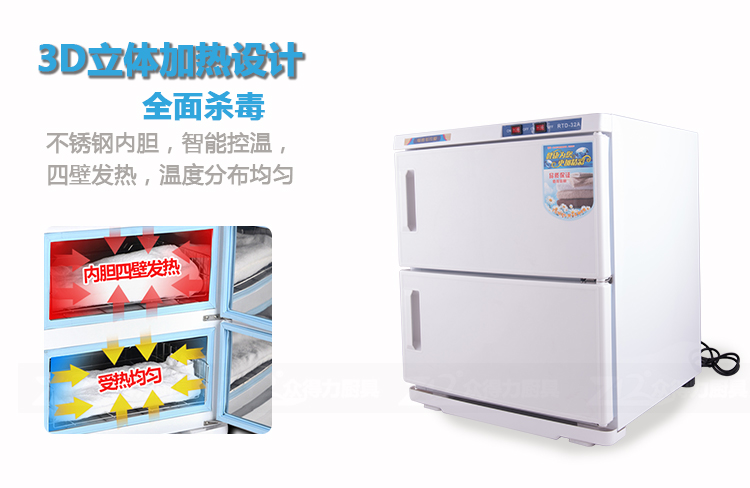 本產品中溫加熱,保溫保濕,毛巾消毒,不再讓細菌和螨蟲威脅您家人的健康和客戶的健康。不銹鋼內膽,智能溫控,四壁發熱,溫度分布均勻。